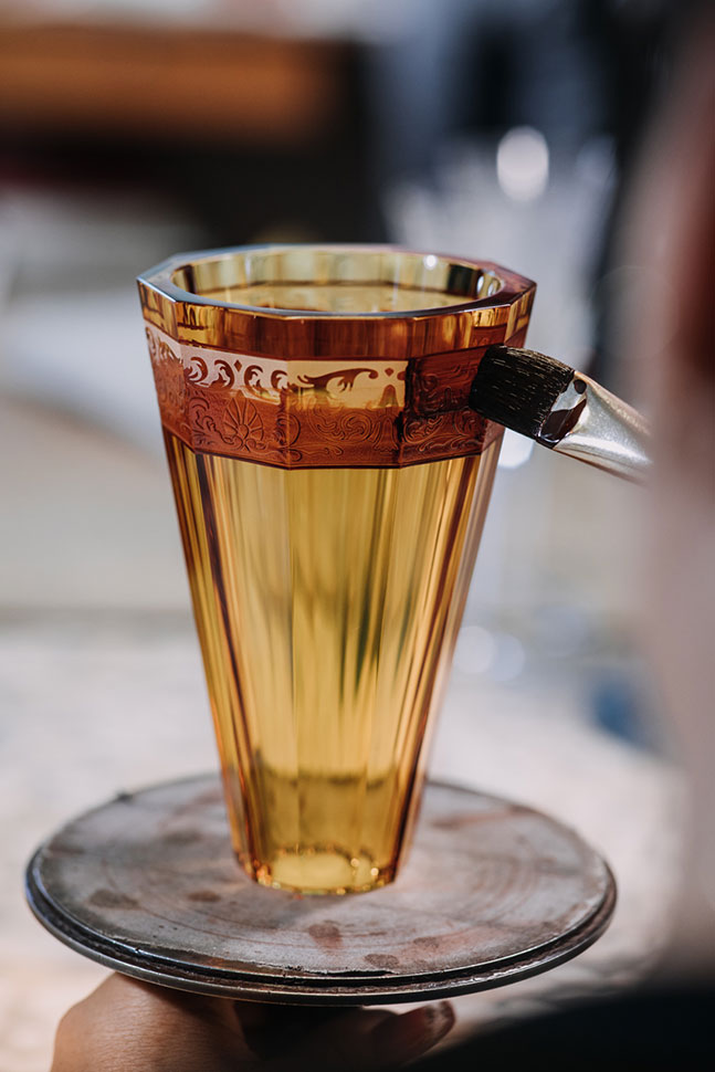 Most of the commissions for royal families go through the painting workshop, something we’re quite proud of. And during each Presidential Speech at New Year’s, people see our glass decorated with gold, since the president has glasses from the Copenhagen Collection on his table. This collection has been in use at Prague Castle since the days of our first president, T. G. Masaryk. We supply the Castle with new pieces while also repairing any damaged glasses (e.g., chips) and gold. But we do the same thing for ordinary clients; Moser is known for allowing anyone with glass marked with the Moser signature to bring it to us, and most of the time, we’re able to repair it to some degree. We’re not miracle workers, but our people are exceedingly skilled.