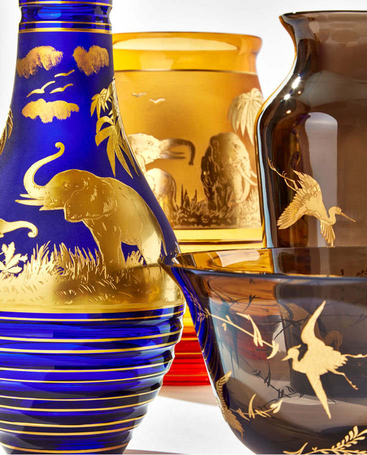 The limited Animor and Hyalith vases were quite difficult; we discovered them in the original design books and brought them back to life. These are vases with oroplastic elephants and giraffes on blue. The background of the vases has to be sandblasted, while the space behind the animals has to be undermined to create a three-dimensional look. Oroplastic is applied to the animals, and the palm trees and grass are then painted in at the painting workshop. The 24-karat gold is brushed on with extraordinary care. The painter can’t touch the sanded area with the gold, since it leaves violet smudges on the glass even when wiped away. Brushes made of squirrel hair embedded in goose feathers are used here. They lock the gold in nicely so it doesn't run off. Decorating these vases was challenging. And they went into the furnace multiple times, since the painter needed to be able to work on the vase while only focusing on one-third of it at a time.