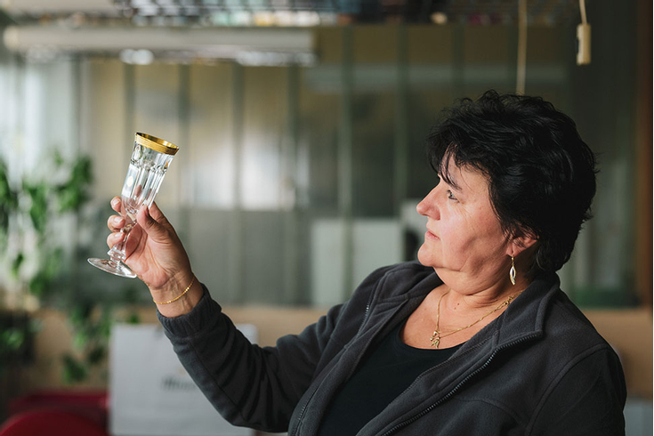 Gold is a symbol of nobility, elevating every glass to a piece of jewellery. At Moser, we exclusively decorate glass with 24-karat gold. We mix it with rosemary and lavender oil, as well as various kinds of resin, to make it pliable and well applicable. Once fired, we then polish it to perfection by hand using precious stones. Moser is the only Czech glassworks to still preserve this traditional method. We use agate and haematite, which must have a completely flat surface. Nobody produces this unique polishing equipment today, which is why it’s handed down from generation to generation. I’m glad to have incredibly talented ladies alongside me in the workshop. I think we make a great team, and we understand each other both personally and professionally.