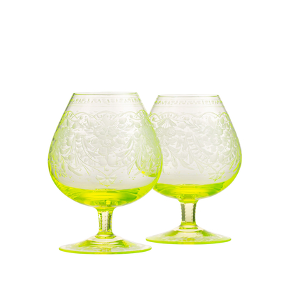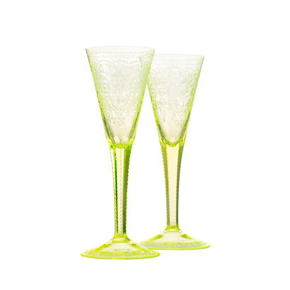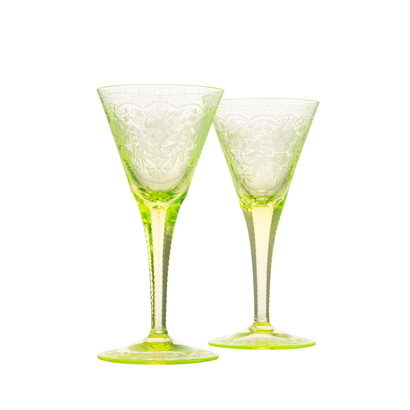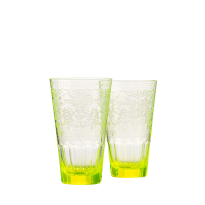In the Maharani collection, the engraved floral motif meets the graceful shape of the goblet, which gradually merges into an elegant stem which is cut into six facets. The richness of the décor is further enhanced with a pearl cut. The delicacy of the engraved lace will stand out on both clear crystal or on one of the typical Moser colour shades (alexandrite, aquamarine, beryl, eldor, rosaline and topaz). Each item of this collection is a testament to the craftsmanship of the Moser glassmasters. Originally this collection is made with 24-karat décor.