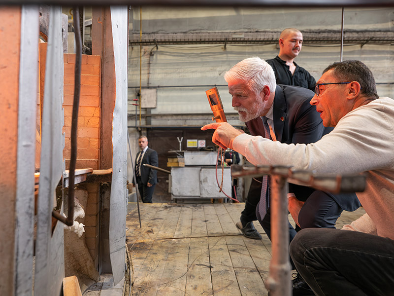 Präsident Petr Pavel und seine Frau besichtigen die Glashütte, begleitet vom Meisterglasmacher Zdeněk Drobný.
