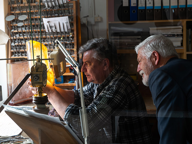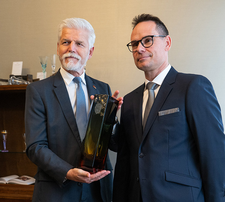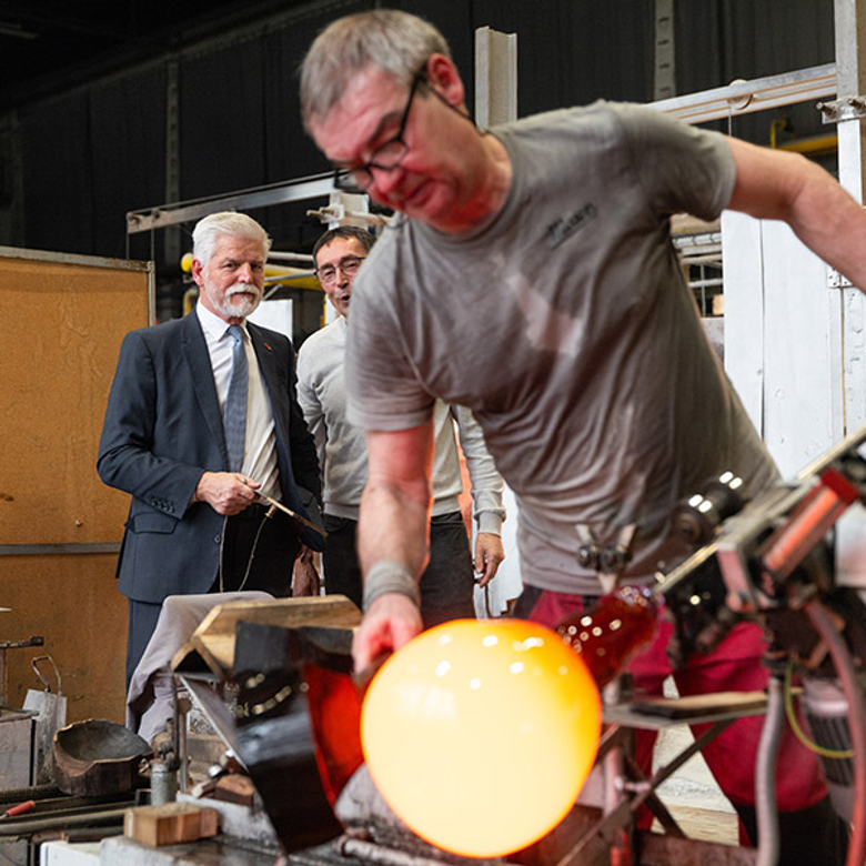 „Die Glashütte Moser ist das Aushängeschild unseres nationalen Glashandwerks, und ihre Produkte repräsentieren uns an vielen Orten der Welt. Es freut mich sehr, dass ich mit eigenen Augen sehen konnte, wie sie entstehen“, sagte der Präsident. Das Paar beobachtete unsere Arbeit am Schmelzofen und in der Gravurwerkstatt, bevor es auch die Boutique besichtigte. Sie trafen Moser-Generaldirektor Martin Dvořák und weitere Mitarbeiter, darunter zwei Ritter des französischen Ordre des Arts et des Lettres: Meisterglasbläser Zdeněk Drobný und Meistergraveur Tomáš Lesser.