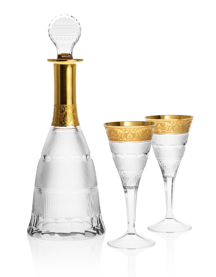 Yes, clients can order glasses and carafes with a golden coat of arms, monogram, or emblem. We collaborate seamlessly with the production and graphics teams, who manage to process the requests so we can transfer them to the crystal. Because drawing something on paper is one thing, while bringing it to glass is another altogether.