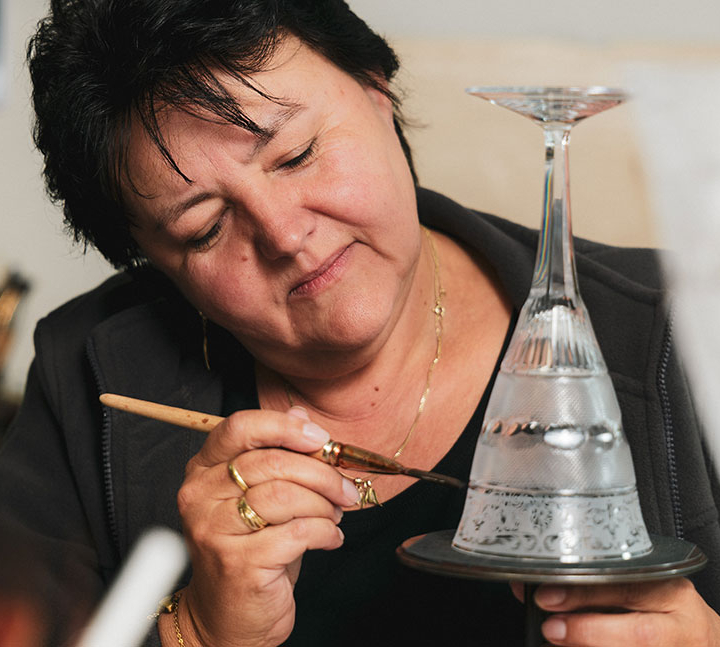 Gold is a symbol of nobility, elevating every glass to a piece of jewellery. At Moser, we exclusively decorate glass with 24-karat gold. We mix it with rosemary and lavender oil, as well as various kinds of resin, to make it pliable and well applicable. Once fired, we then polish it to perfection by hand using precious stones. Moser is the only Czech glassworks to still preserve this traditional method. We use agate and haematite, which must have a completely flat surface. Nobody produces this unique polishing equipment today, which is why it’s handed down from generation to generation. I’m glad to have incredibly talented ladies alongside me in the workshop. I think we make a great team, and we understand each other both personally and professionally.