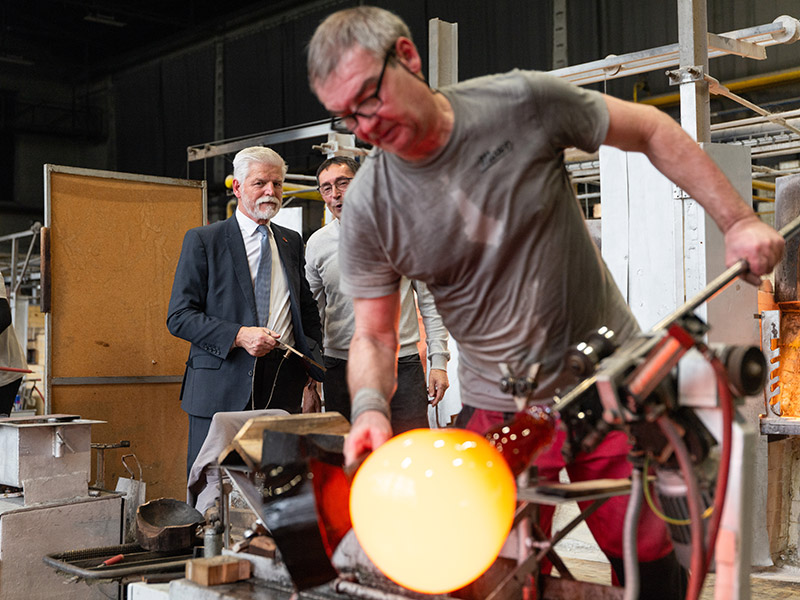 President Petr Pavel and his wife touring the glassworks, accompanied by master glassmaker Zdeněk Drobný.