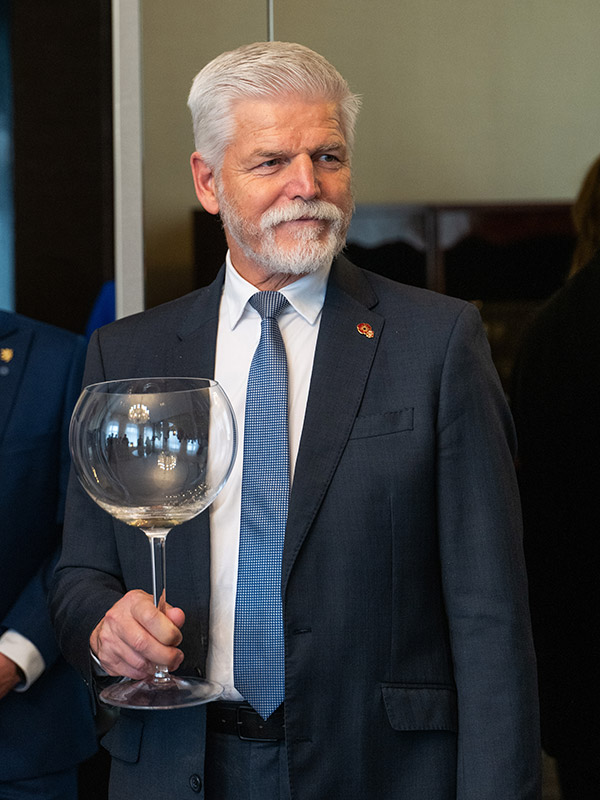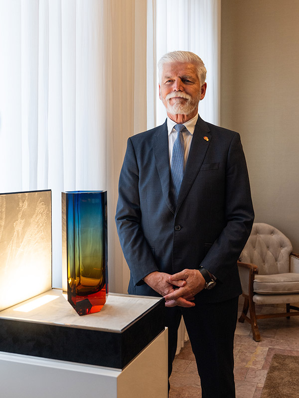 The President received the Magnus vase as a commemorative gift from the glassworks. Its unique colouring, a combination of topaz glass underlaid with blue, is a brand-new creation in the glassworks’ history. And the engraved lion, a symbol of strength and courage, is the work of Tomáš Lesser.